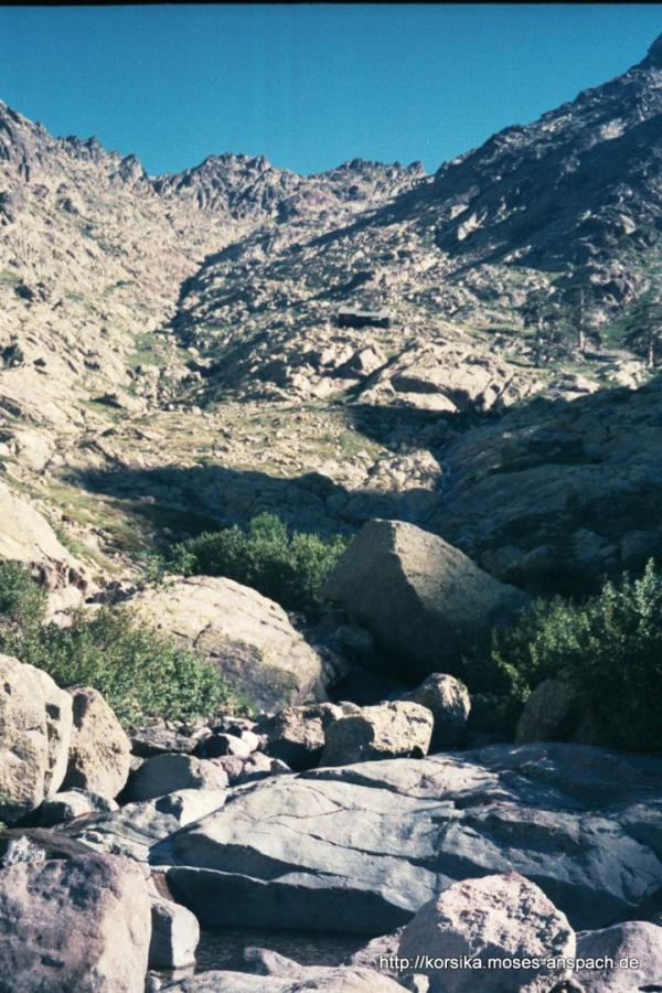 Hier geht es die letzte große Steigung hoch zum Lac de Nino. Das Hochtal ist zwar 1700m hoch, aber hier ist es im Sommer richtig heiß, weil es von den Bergen ringsum gut geschützt liegt. Glücklicherweise gibt es am See eine zuverlässige Quelle. Oft sind halbwilde Schweine oder Pferde rund um den See zu finden.
